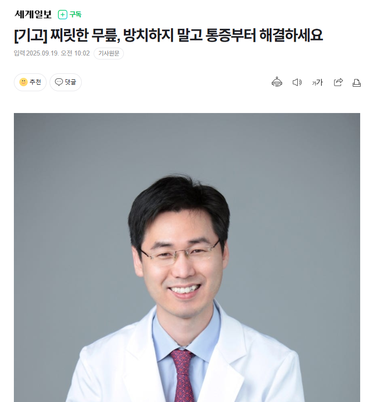 우리 신체에서 몸의 체중 대부분을 지탱하는 부위가 어디인지 아시나요? 바로 무릎입니다. 매우 중요하면서도 나이가 들수록 퇴행성 변화로 인한 손상을 피할 수 없는 부위이기도 한데요. 노화가 가장 큰 원인이라고 알려진 무릎통증이 최근엔 열심히 운동하는 젊은 층에서도 적지 않게 나타나고 있습니다. 체중을 지탱하는 것 뿐만 아니라 걷고, 계단을 오르내리고 쪼그려 앉는 등 우리가 일상에서 움직일 때 끊임없이 사용되는 이 무릎을 최대한 오래오래 건강하게 사용하기 위해서는 무릎관련 질환의 증상과 치료, 예방법에 대해 알아두는 것이 좋습니다.