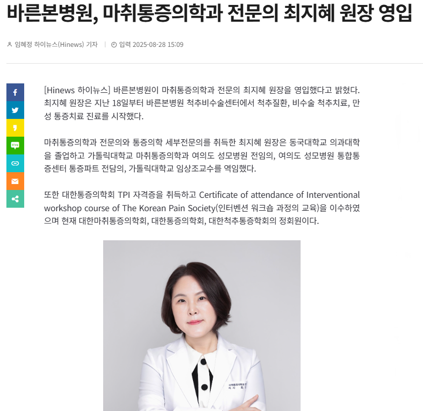 [Hinews 하이뉴스] 바른본병원이 마취통증의학과 전문의 최지혜 원장을 영입했다고 밝혔다. 최지혜 원장은 지난 18일부터 바른본병원 척추비수술센터에서 척추질환, 비수술 척추치료, 만성 통증치료 진료를 시작했다.